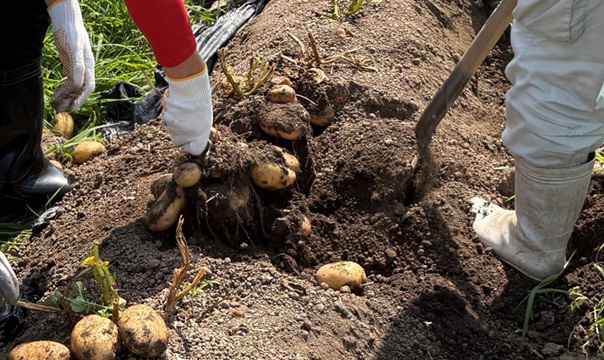 農業委員がサポートをしながら芽出し作業、草取り作業を経て、最終回は収穫を行った。自分たちが育てたジャガイモの大きさを見て参加者からは笑みがこぼれ、1組3~4キロものジャガイモが収穫できたことで、いっぱいになった袋をうれしそうに持ち帰った。